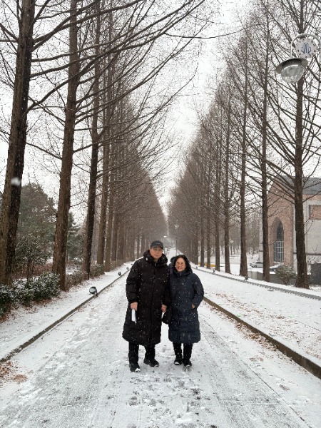 우리가 묵을 숙소를 향해 가는 길은 하얀 눈이 쌓여서 밟으면 뽀도독뽀도독 소리가 났다. 숙소 가는 길 양옆에 곧게 죽죽 뻗은 가로수(메타세쿼이아 Metasequoia)가 눈을 맞아 마치 영화속 배경처럼 줄지어 서 있는 모습은 또 얼마나 운치를 느끼게 하는지, 나는 눈길에 넘어지지 않으려고 남편과 팔짱을 끼고 눈 덮인 하얀 길을 걸으면서 데이트를 즐겼다. 그리고 오며 가며 아름다운 눈 덮인 풍경을 핸드폰으로 찍었다.