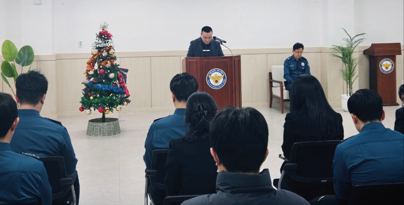 이어 8기동단 단장 이주환 총경이 성탄절을 맞아 열린 성탄감사예배에서 축하 메시지를 전하며, 한 해 동안의 노고에 대한 감사와 새해를 향한 소망을 전했다. 이 총경은 인사말을 통해 “오늘은 특히 감사의 말씀을 더 많이 드려야 할 것 같아 원고를 준비하지 않고, 여러분의 얼굴을 직접 바라보며 마음을 전하고 싶어 이 자리에 섰다”며 예배에 함께한 이들에게 깊은 감사의 뜻을 밝혔다. 이어 “성탄절 감사예배를 함께 드릴 수 있음이 감사하고 영광스럽다”고 말했다. 특히 예배를 준비한 직원선교회에 대해 “인원은 많지 않지만 한 해 동안 여러 차례 귀한 자리를 정성껏 준비하는 모습을 보며 큰 감동을 받았다”며 격려의 말을 전했다. 또한 각자의 자리에서 성실히 사명을 감당해 온 직원들에게도 감사를 표했다. 이 총경은 2025년을 앞두고 경찰 조직이 맞이한 시대적 변화에 대해서도 언급했다. 그는 “이제는 단순한 명령 수행을 넘어 국민의 인권과 헌법적 가치를 판단해야 하는 중요한 전환점에 서 있다”며 “특히 지난 한 해는 사회적으로도 매우 부담스럽고 어려운 시기였다”고 돌아봤다. 이어 그는 “탄핵 정국 등으로 사회적 갈등이 심화된 상황 속에서 경찰은 질서를 유지하는 가운데 매우 어려운 역할을 감당해야 했다”며 “그럼에도 불구하고 오늘 이 자리에 함께한 여러분의 헌신과 수고, 그리고 특히 남은미 경목실장님과 신동호 목사님께서 기도로 함께해 주신 덕분에 큰 불상사 없이 한 해를 감당할 수 있었다”고 깊은 감사를 전했다. 또한 성탄의 의미에 대해 “예수님께서 낮은 곳으로 임하신 것처럼, 경찰 또한 낮은 자리에서 소외된 이웃을 섬기라는 사명이 있다고 생각한다”며 “성탄절을 맞아 이러한 사명을 다시 마음에 새기고 더욱 겸손히 봉사하겠다”고 밝혔다. 끝으로 이 총경은 “올 한 해 동안 보내주신 기도와 응원에 진심으로 감사드린다”며 “남은 연말 잘 마무리하시고 새해에도 하나님의 은혜와 평안이 함께하길 바란다”고 인사를 전했다. 이어 “공식적으로 인사드리는 자리는 이번이 마지막일 수 있지만, 앞으로도 계속 기도로 동행해 주시길 부탁드린다”고 덧붙였다. 이번 성탄감사예배는 경찰 선교 사역의 의미를 되새기고, 공동체가 한자리에 모여 감사와 소망을 나누는 뜻깊은 시간이 됐다.